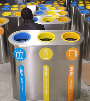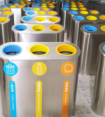三合一不銹鋼垃圾箱核心部件可模壓成型不脫焊不易破損堅固耐用。全桶身不銹鋼制作的垃圾箱還具有防火功能,三合一于一體,搭配三色噴塑投口和與之對應的箱體垃圾分類標識及文字說明,清晰醒目辨識度高有利從源頭規范可回收物、其他垃圾、有害垃圾常規的三分類垃圾投放,還可做商場、地鐵站一般垃圾、瓶罐廢料、紙類廢料等分類垃圾收集使用;斜面投口款式新穎突顯個性,焊點平整光滑整體高雅美觀,無利口不傷手;可根據客戶需求選配鍍鋅內桶或玻璃鋼內桶。