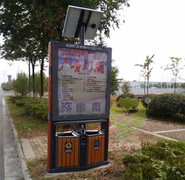 太陽能廣告垃圾桶的型號規(guī)格:GG9,900*400*2000mm,隨著城市美化與亮化的推進,垃圾箱將會在城市的發(fā)展中擔當重要角色,作為一與百姓生活密切相關的載體,在垃圾桶上刊登廣告將能夠有效吸引消費者的眼球,產(chǎn)生非常好的廣告效果,對于樹立公司良好形象以及提高公司知名度,并提高廣告招商力度具有深遠的意義。廣告垃圾桶燈箱具有、投入成本低,直接受眾效果好。 相比較其他形式的廣告而言垃圾桶廣告的成本相當?shù)投沂侵苯用嫦驈V告受眾,貼進消費者,形成高覆蓋網(wǎng)絡規(guī)模廣告效應。比起電視和報紙廣告來說有著無法擬比的優(yōu)勢。
