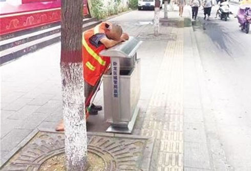 老環衛工趴在果皮箱休息 感動朋友圈